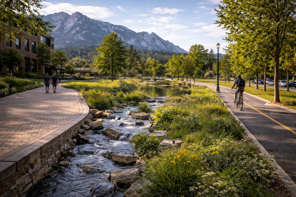 Rather than treating sustainability as a separate initiative, Boulder weaves it into how streets, parks, and neighborhoods function.