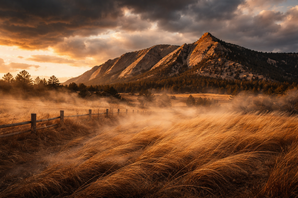 Boulder’s location at the edge of the Rocky Mountains creates a natural wind accelerator, where air flows over the peaks, descends rapidly through the foothills, and intensifies as it moves toward the plains.