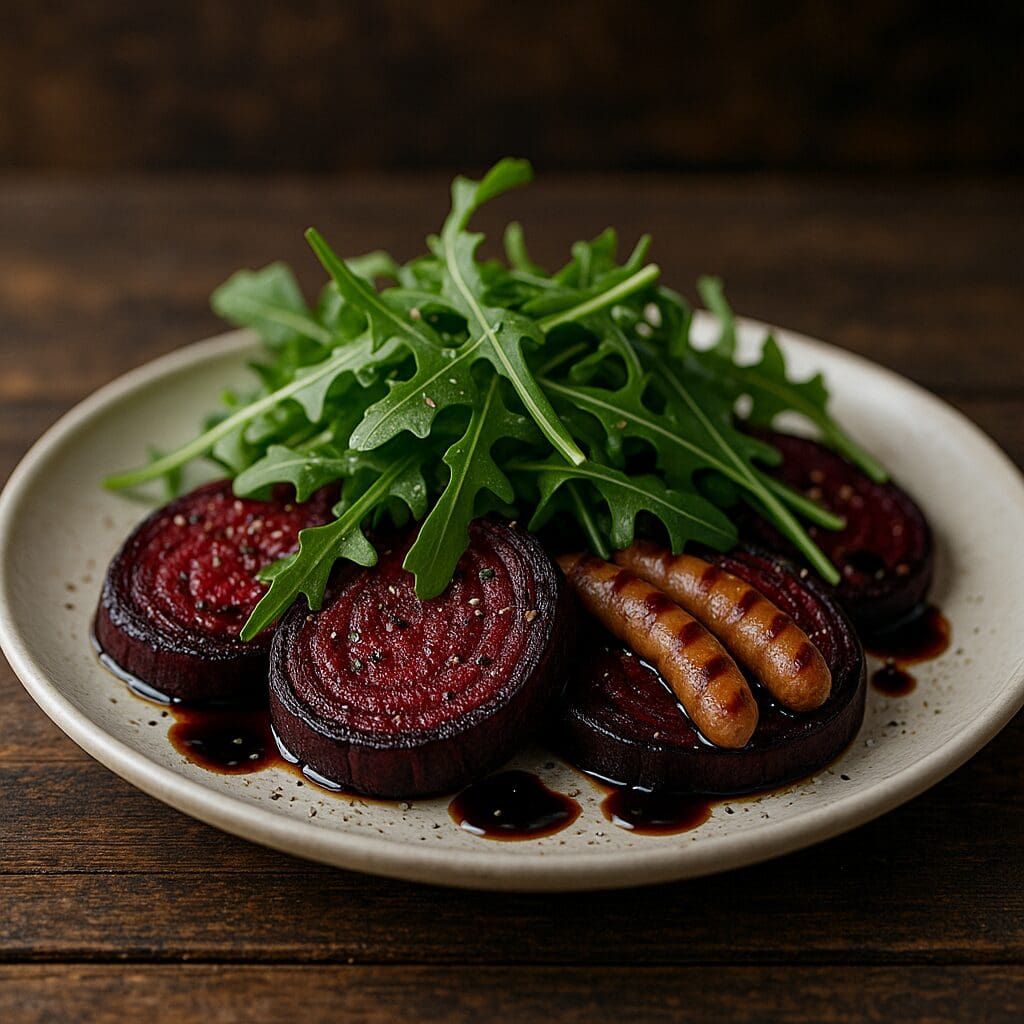 A vibrant plate featuring smoked beets, fresh arugula, and a grilled vegan sausage—bringing bold Boulder flavor to the backyard grill.