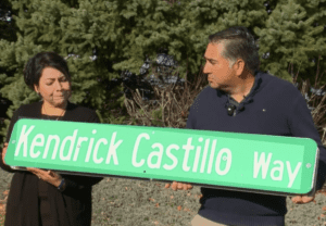 John and Maria Castillo holding a sign for the newly renamed Kendrick Castillo Way.