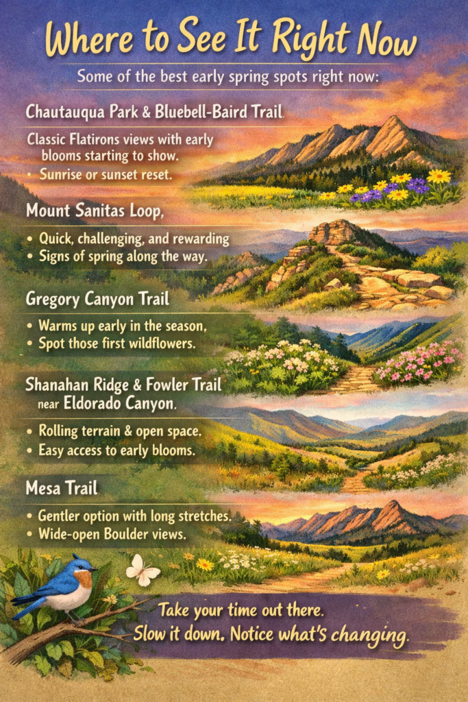 Classic Flatirons views with early blooms starting to show. Perfect for a sunrise or sunset reset.