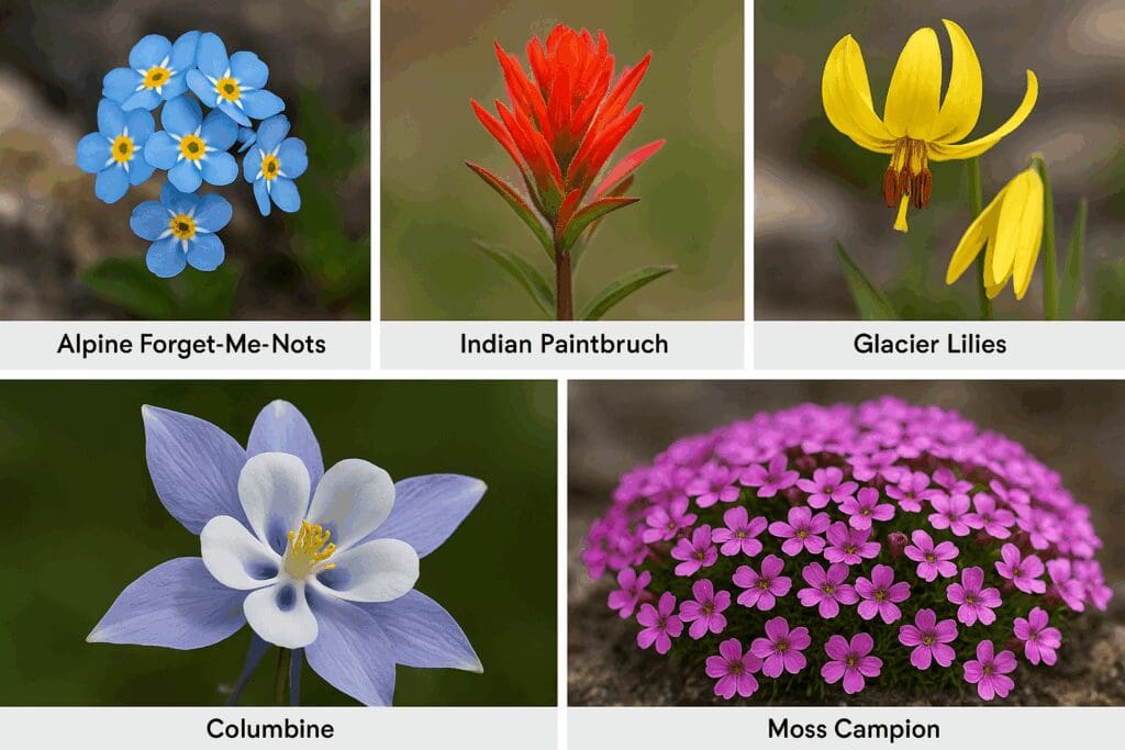 A vibrant spring tapestry in Boulder’s high country—featuring sky-blue Alpine Forget-Me-Nots, fiery red Indian Paintbrush, sunny yellow Glacier Lilies, pale blue-and-white Columbines, and soft pink Moss Campion, all set against a shimmering mountain lake.