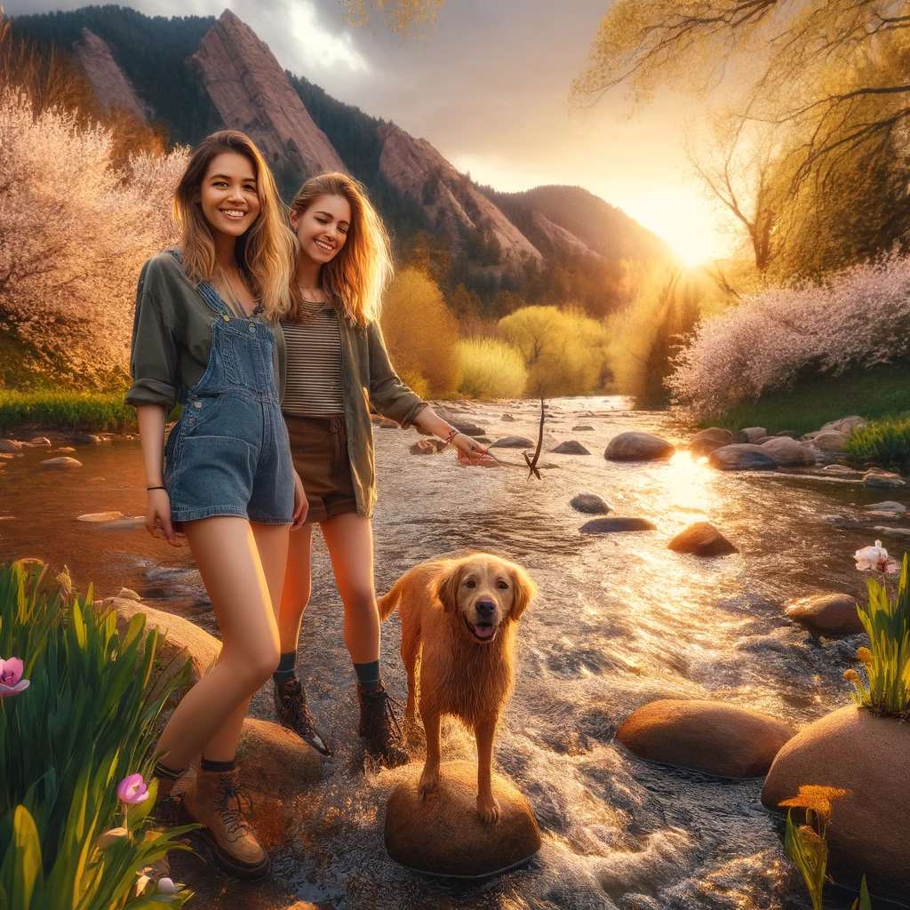 The Rush of Boulder Runoff: A Scenic Sunset with Furry Friends