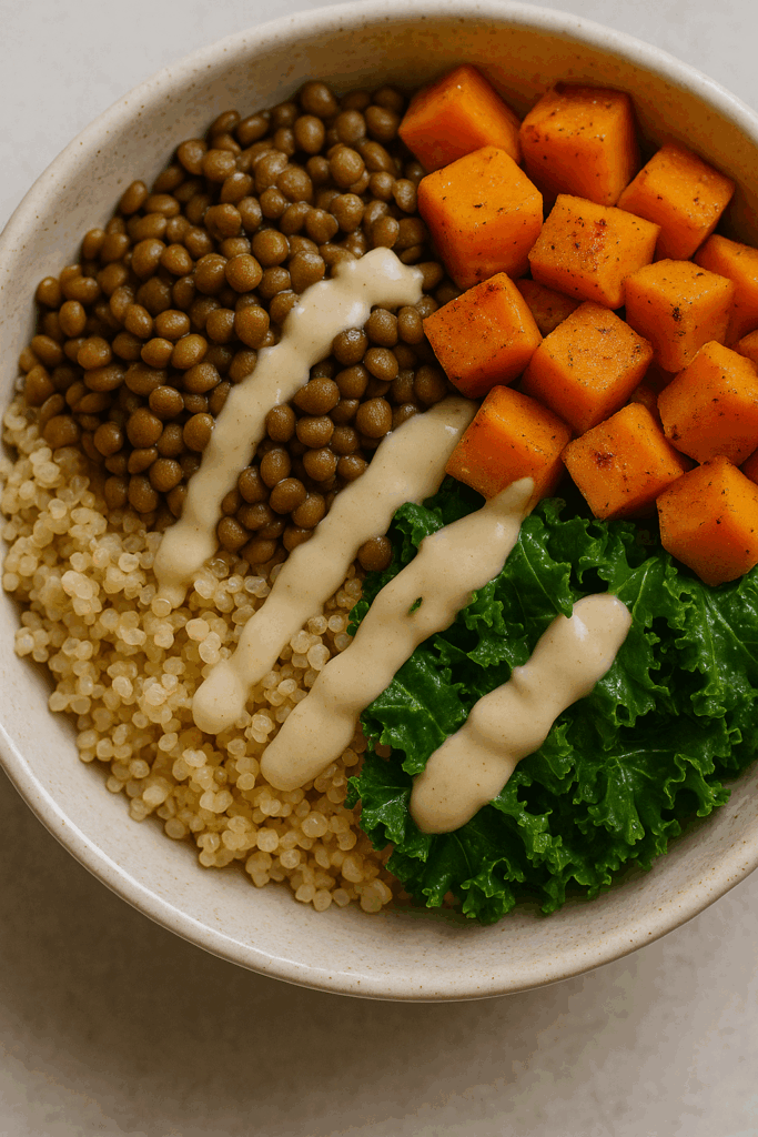 Vegan lentil–sweet potato bowl with quinoa, kale, and tahini-lemon drizzle.