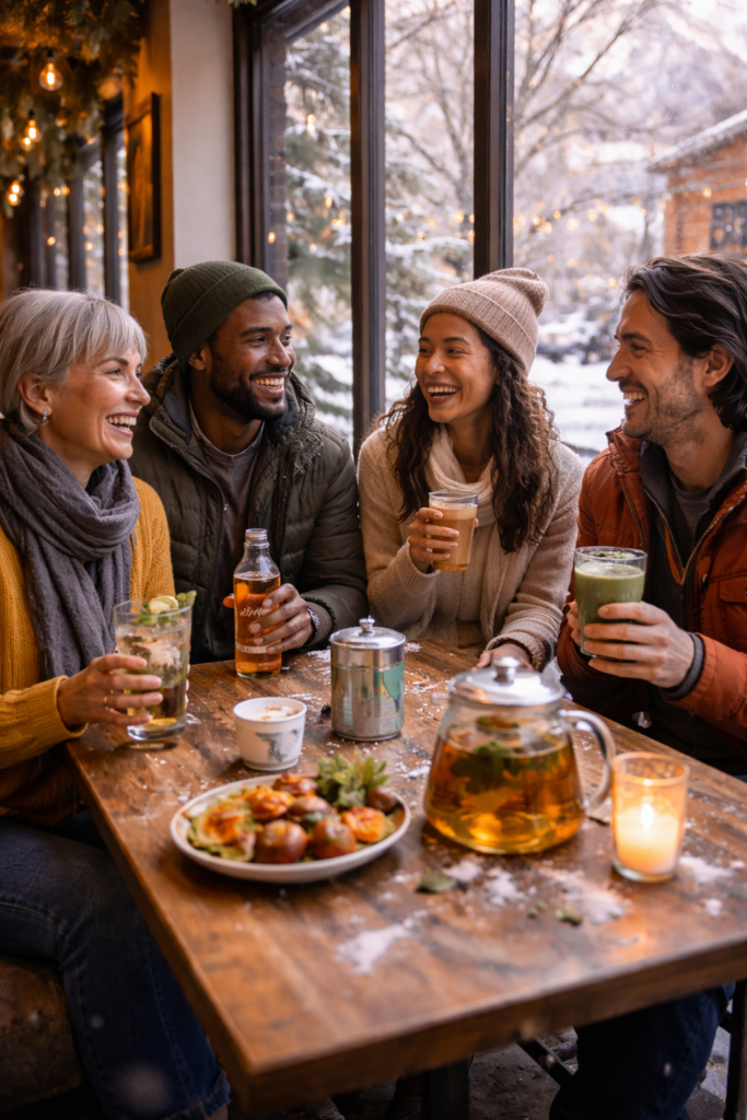 A pressure-free Boulder moment—friends connecting over tea, sparkling water, and conversation, where social life isn’t centered on alcohol but on presence, movement, and shared time.