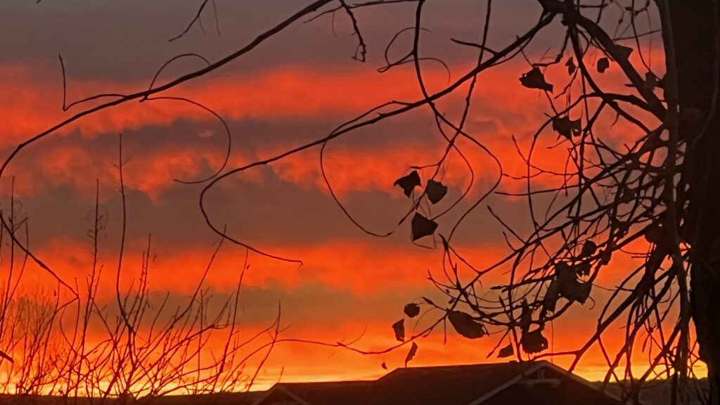 From the eastern edge of Boulder, the sunrise unfolds in deep oranges, glowing reds, and warm golds that spill across the horizon. The trees stand dark and steady in the foreground, their silhouettes grounding the scene as the sky puts on its full performance. There’s a stillness here that only exists in winter mornings—when the air is crisp, the ground is cold, and the light feels earned.